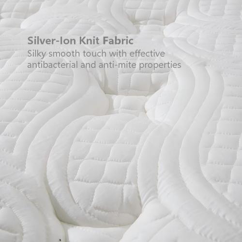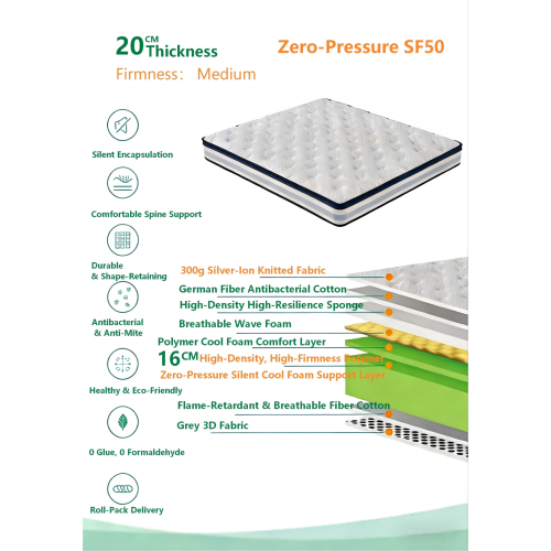 - 二重の抗菌性と肌に優しい表面: ほとんどのマットレスは、表面に抗菌剤がコーティングされているだけですが、時間の経過とともに抗菌剤は消えてしまいます。ただし、SF-50 は異なります。銀イオンが生地の繊維に直接注入されています。ドイツの抗菌綿と組み合わせることで、99% 持続する抗菌・防ダニ効果が得られ、お母さんと赤ちゃんのための防ダニマットレスの基準を満たし、敏感肌の方のための抗アレルギーマットレスのニーズを満たしています。さらに、そのシルキーなタッチは、必要なコアサポートを失うことなく、中程度の硬さのマットレスのわずかな「硬い感触」を取り除きます。