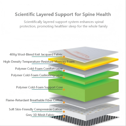 - コア層:耐熱メモリーフォーム + 高ポリマーコールドフォーム + 難燃性繊維綿 + 3D 通気性メッシュ (6 面通気性により、カビの発生を防ぎます)